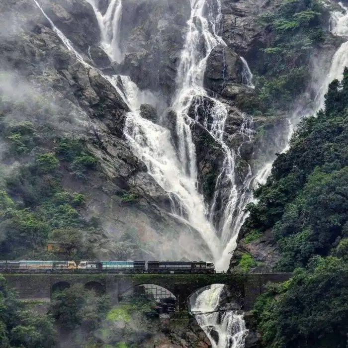 Железная дорога пересекает водопад Дудхсагар в Гоа, Индия