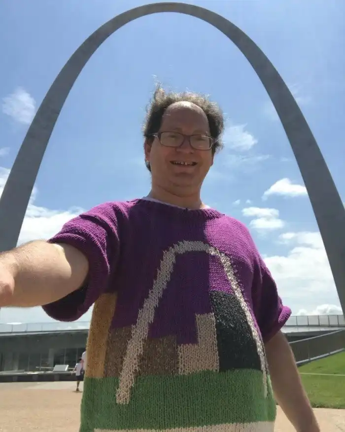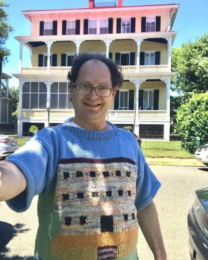 Каких только хобби не существует. При всём многообразии американский художник Сэм Барски выбрал для себя в качестве увлечения вязание. Да не просто носочки да шарфики, а свитера с изображением достопримечательностей, на фоне которых он потом и фотографируется.