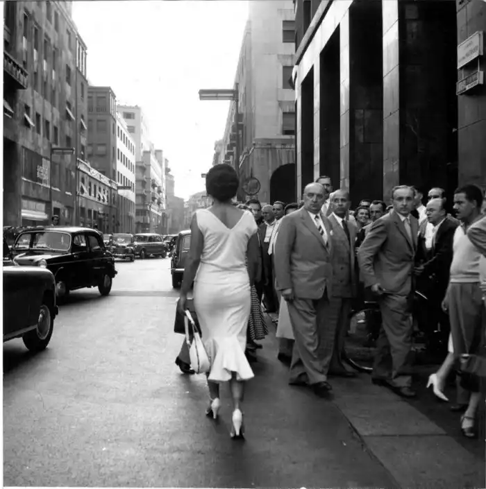 Ещё одна сцена из прошлого. Судя по транспорту это даже не 60-е годы, а ещё раньше. Ну и дамам надо отдать должное. Выглядят отлично и реакция мужчин на снимке это подтверждает.