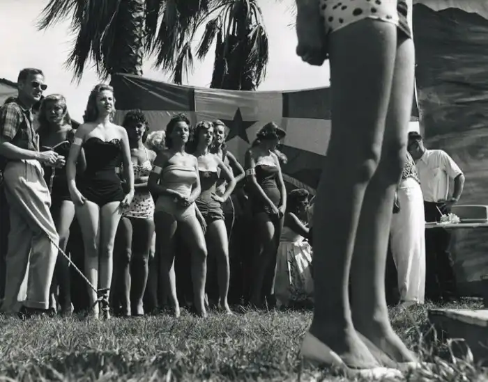 Кстати о привлекательности и конкурсах красоты. Глядите, какие чудеса когда-то творились. Лица специально скрывали, что б жюри могло оценивать только фигуру. Ничего подобного сегодня представить невозможно. Даже боюсь предположить, какой шум начнется в интернете, если будут проводить конкурс в таком формате.