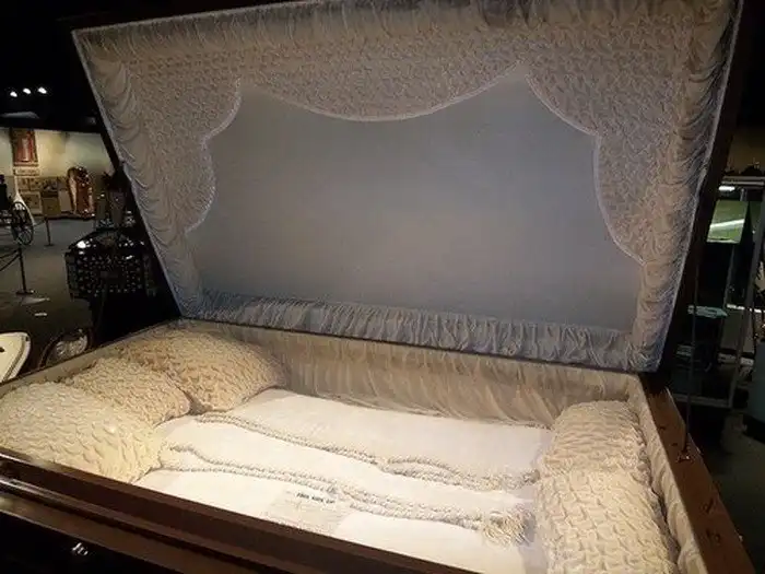 19. Этот гроб для 3 человек был сделан на заказ для скорбящей пары, потерявшей любимую дочь. Они намеревались покончить жизнь самоубийством и быть похороненными вместе с ней. Они так и не вернулись за гробом, и теперь он выставлен в Национальном музее истории похорон в Хьюстоне, штат Техас