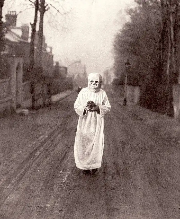 26. Фотография проповедника 1911 года. Он носил маску в виде черепа, ходил по городу и читал проповеди о смерти