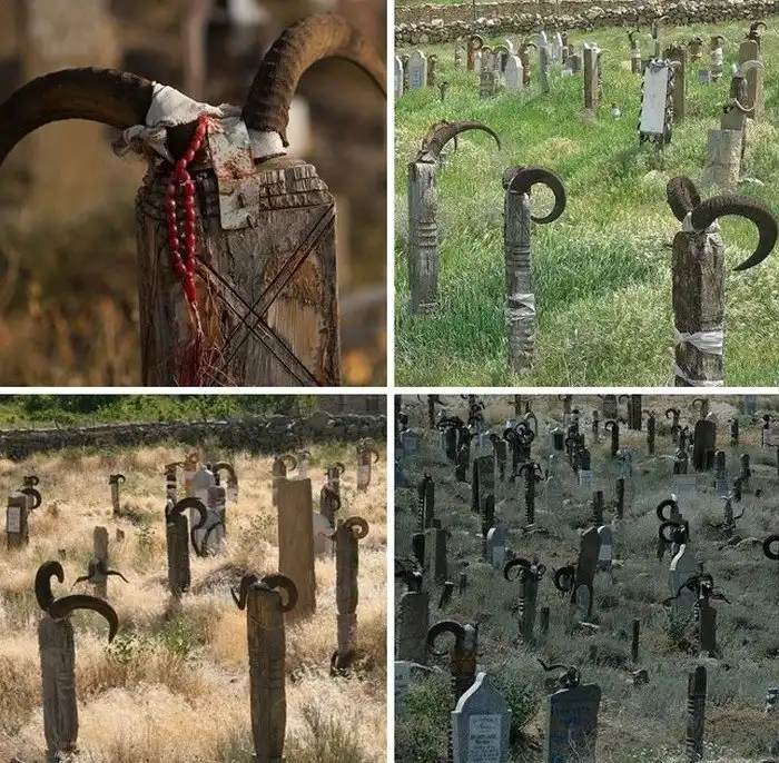 19. Могилы, украшенные козьими рогами, на Нохурском кладбище в Туркменистане. Рога являются частью местной традиции и предназначены для защиты от зла