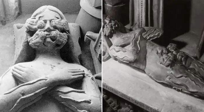 35. Надгробная скульптура Франсуа де Сарра в замке Ла Сарра, Швейцария, которая показывает, как его тело поедают лягушки и черви, XV век