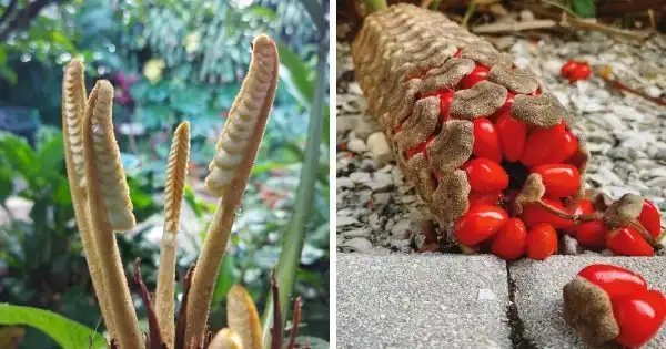 На фотографии слева замия только готовится цвести. Справа представлены уже созревшие цветения.