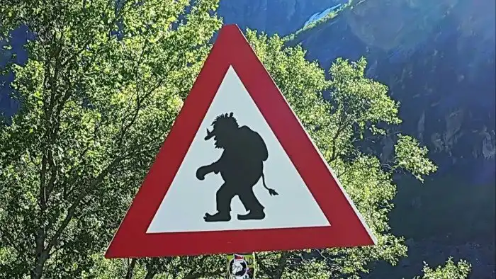 Тролли там считаются персонажами местного фольклора, строящими козни. То есть знак предупреждает, что водители в любой момент столкнулся с «нечистой», если потеряют бдительность.