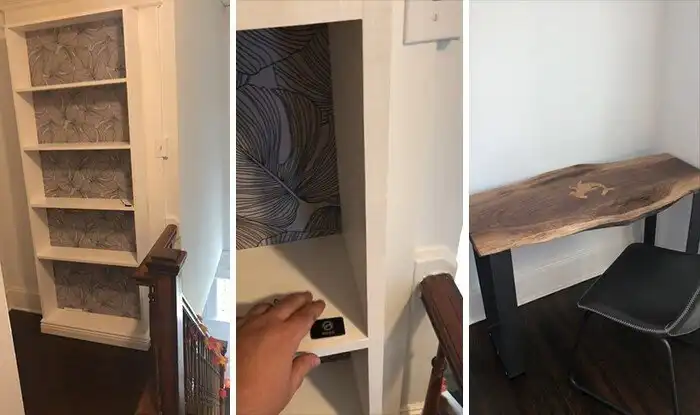 Потребовалось 5 дней, чтобы построить тайную дверь в офис и письменный стол туда. Я могу открыть дверь с помощью приложения или с помощью ключ-карты