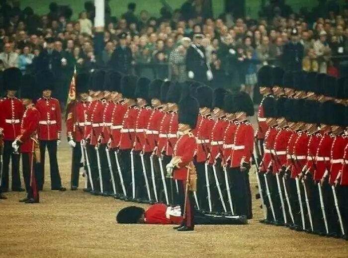 18. Гвардеец потерял сознание во время церемонии, но остальных это не отвлекло. Лондон, 1966 год