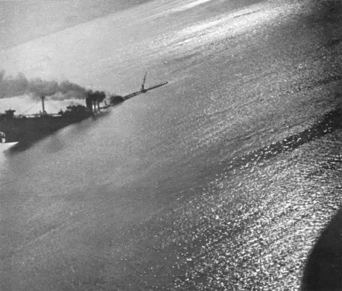11. Вид на тонущий транспорт из конвоя PQ-17 с борта немецкого бомбардировщика Ю-88. Баренцево море. 1942 г.