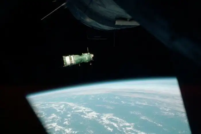 17. Космический корабль «Союз-19» в полете. Фото с космического корабля «Аполлон-18». Июль 1975 г.