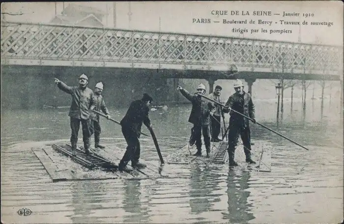 23. Пожарные плывут на вызов во время наводнения в Париже, январь 1910 года.