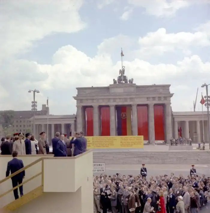 38. Президент Кеннеди осматривает Бранденбургские ворота за Берлинской стеной, 26 июня 1963 г.