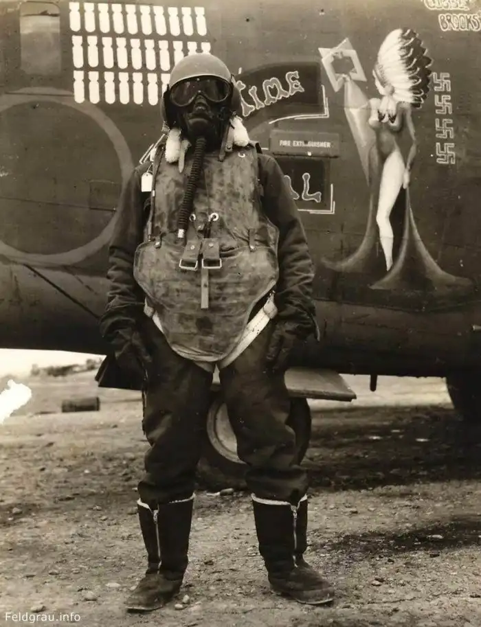 Шлем M4 с защитными очками Polaroid B-8, утепленная куртка, летный костюм F-2 с электрообгревом, куртка пилота B-3, кислородная маска A-14, перчатки и сапоги летчика. Свастики обозначают количество сбитых самолетов противника, бомбы - количество боевых вылетов. Нарисованную индейскую девушку изначально звали Wattacrok. Новый экипаж посчитал это имя ужасным и переименовал самолет в «Tepee Time Gal». Каждый член экипажа нанес свое имя на самолет.