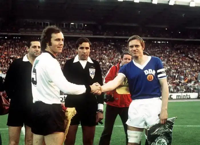 38. Капитаны команд: ФРГ (Франц Беккенбауэр) и ГДР (Бернд Бранш) — перед матчем во время ЧМ. Гамбург, 22 июня 1974 года