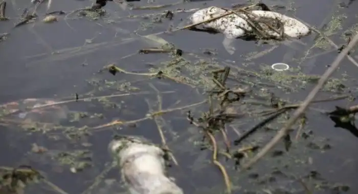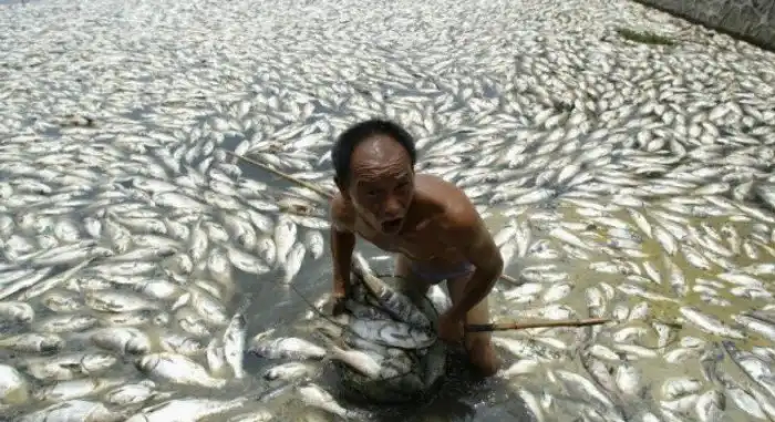 Рыбак убирает из озера рыбу, погибшую из-за загрязнения воды