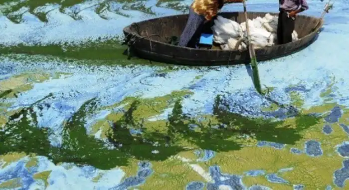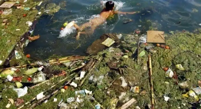 Этот ребенок плавает в цветущих водорослях. Цветение вызвано чрезмерным сельскохозяйственным стоком, создающим «мертвые зоны»