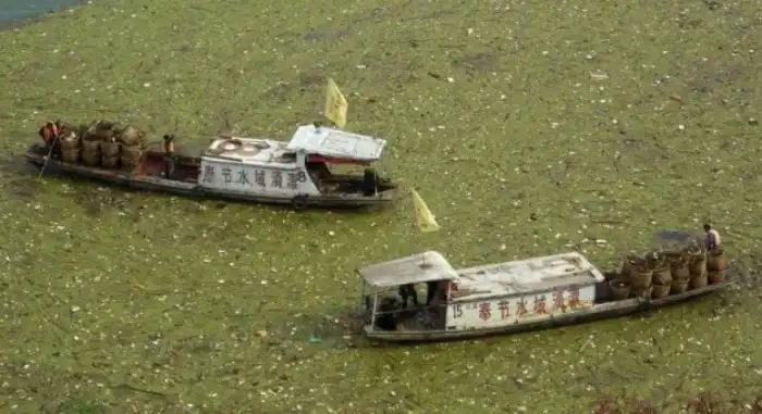 Это озеро в Хэфэе целиком загрязнено и заросло водорослями в поверхностном слое
