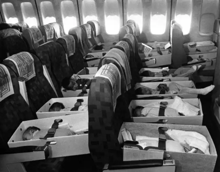 Малыши, потерявшие родителей во время войны во Вьетнаме, переправляются в США на усыновление, 1975 год