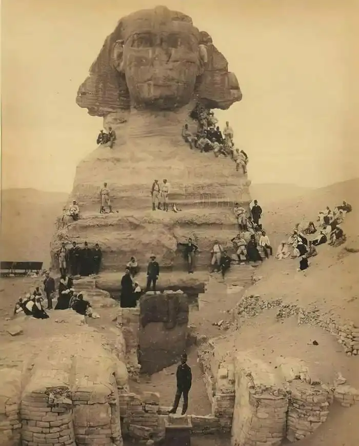 Туристы, облепившие Сфинкса для памятного фото, 1850-е гг.
