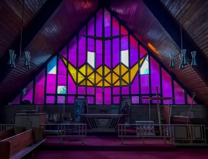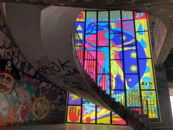 Красивый витраж в заброшенном элитном ресторане с видом на Лиссабон, Португалия