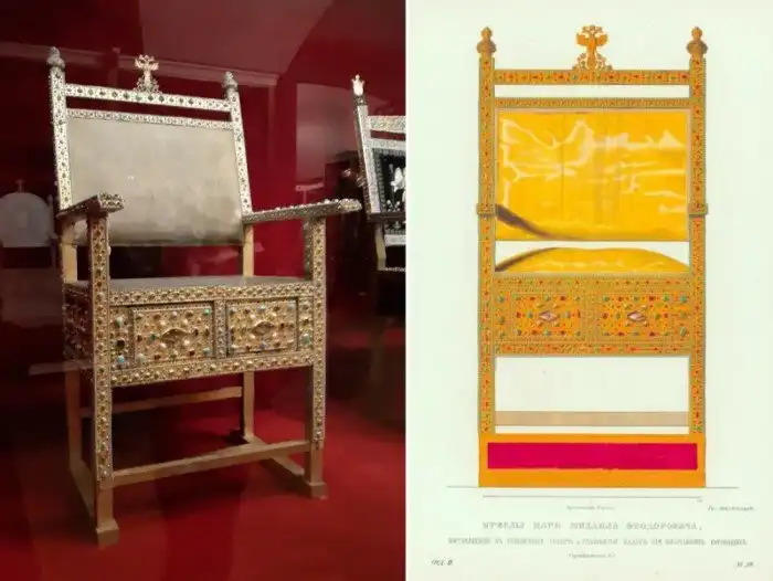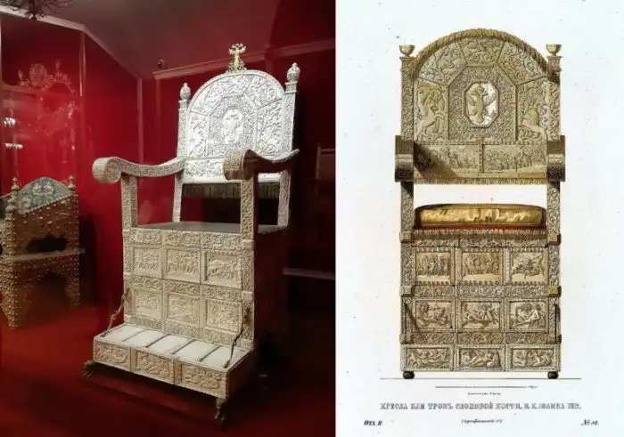 Считается, что престол принадлежал Ивану Грозному, но первые упоминания о нем появились только через несколько десятилетий после его смерти – в середине XVII века. Авторство и страна происхождения трона также остаются под вопросом. Во время коронации Николая II на нем сидела вдовствующая императрица Мария Федоровна.