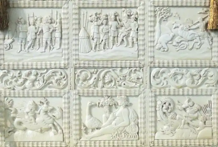 Деревянный трон покрыт листами слоновой кости, отсылка к трону царя Соломона в Библии. На резных панелях из слоновой кости изображены сцены из жизни царя Давида. Двуглавый орел украшает спинку и такой же орел, но в золоте, венчает кресло.