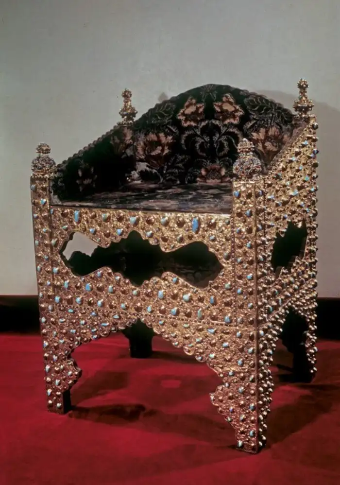 Этот роскошный трон был изготовлен персидскими мастерами в конце XVII века. Историки остаются в недоумении, как он оказался во владении Алексея Михайловича (Алексея Русского). По одной версии, это был подарок персидского шаха, по другой – подарок армянской торговой компании, по третьей – просто купленный русским царем. Как бы то ни было, после приобретения престола начались переговоры о разрешении персидским купцам осуществлять транзитную торговлю в России.