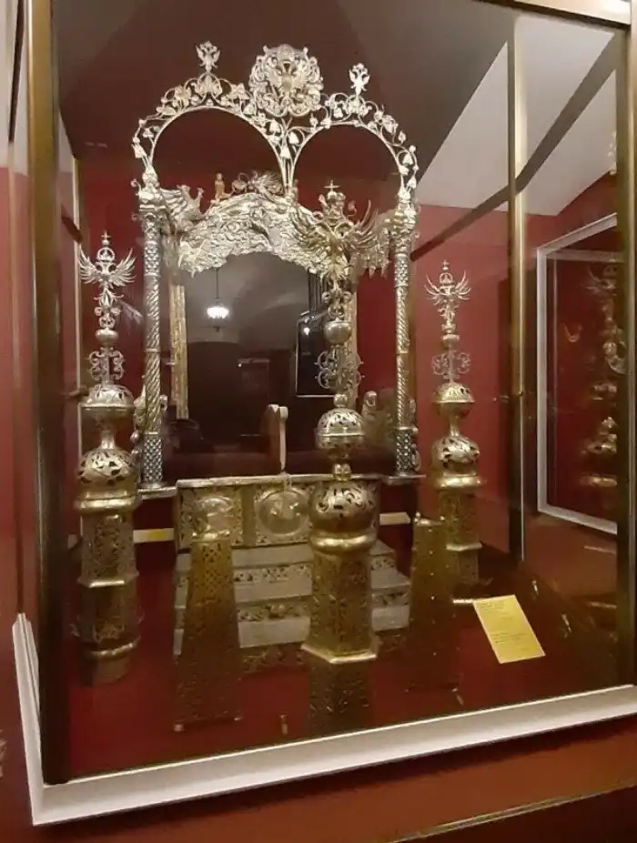 Это был еще один подарок шаха Аббаса Великого - на этот раз первому царю династии Романовых Михаилу Федоровичу (Михаилу Русскому). Он был изготовлен персидскими мастерами в начале XVII века. Деревянный каркас покрыт листовым золотом и драгоценными камнями, в том числе сотнями рубинов, турмалинов и сапфиров, а также жемчугом.