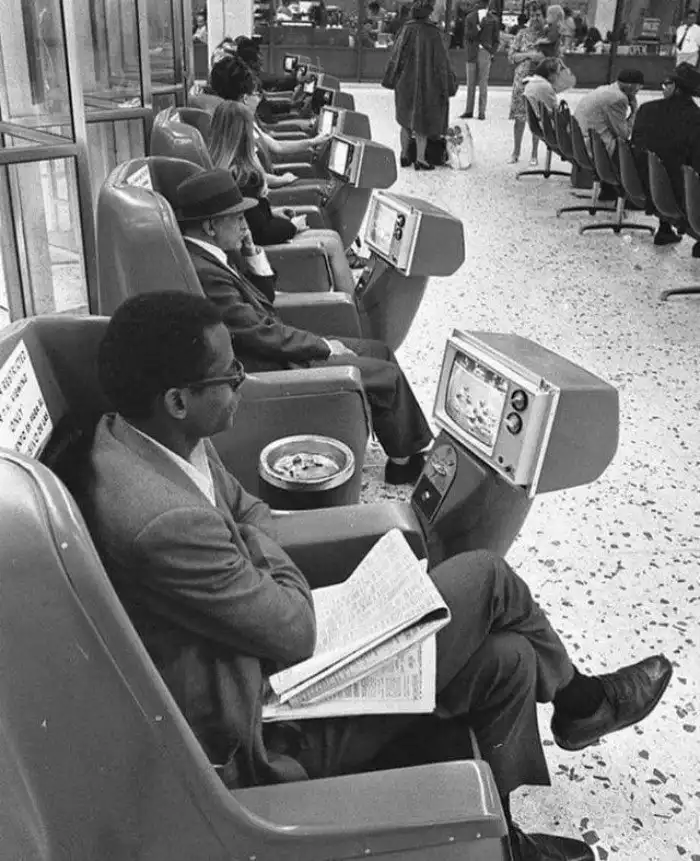 Пепельницы и стулья с телевизором и оплатой монетами на автовокзале Лос-Анджелеса, 1969 год