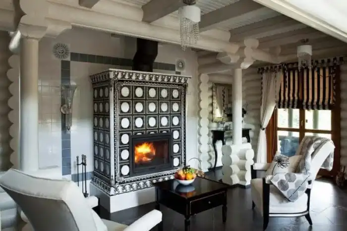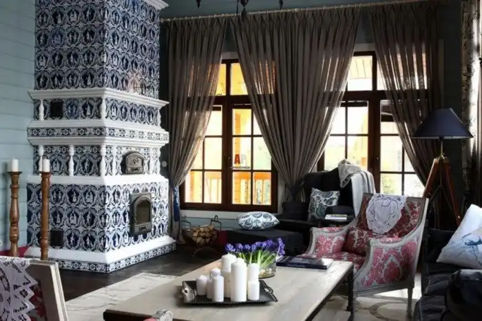 Если очень хочется, то окунуться в атмосферу славянского стиля можно установив печь. Декоративную или оформить камин в виде печи.
