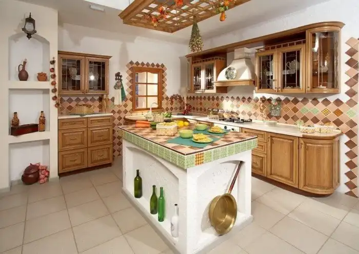 Расписные прихватки, фартук, подушки на сидения стульев, деревянные панели на стенах под видом бревен, гарнитуры с дверцами без глянца, любые отделки, имитирующие фактуру дерева - все это составляющие детали стиля.