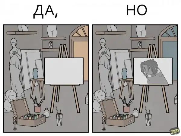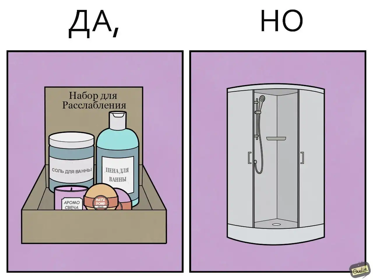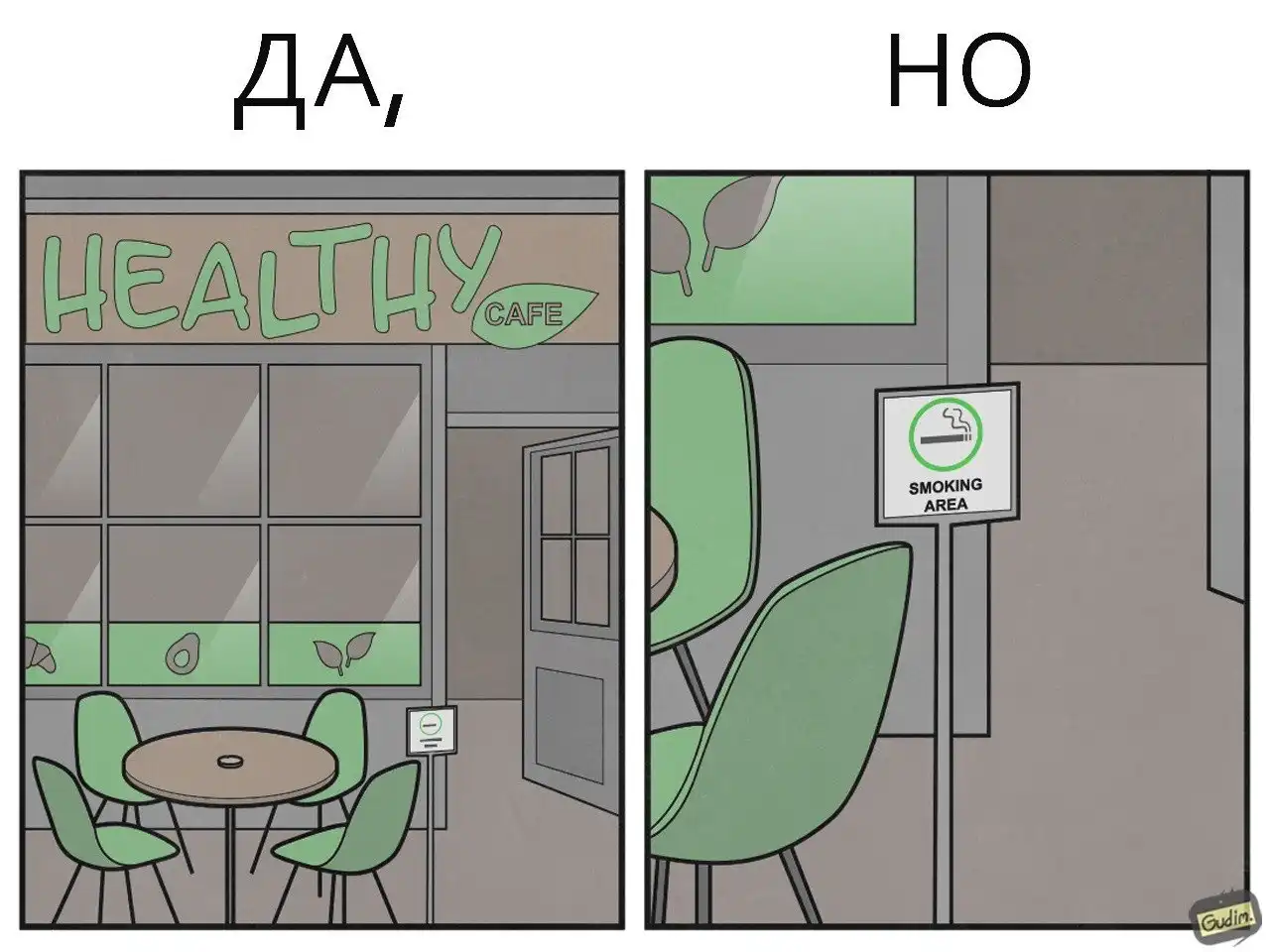 Антон Гудим - это популярный иллюстратор из России. У него много разных проектов, один из них "Да, но". Автор показывает в двух картинках целую историю, демонстрируя, что у всего есть обратная сторона.