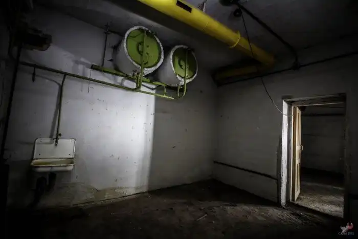 Помимо зала укрываемых и герметичных тамбуров удалось осмотреть санузел. Там всего пару раковин, и пару унитазов. Напротив раковины, внизу, установлена маленькая батарея, которая жарит теплом.Скорее всего, именно система отопления в зимнее время, не позволяет объекту прогнить от влаги. Если отопление в убежище не подавать, оно быстро "отсыреет" и превратится в рассадник ржавчины и плесени.