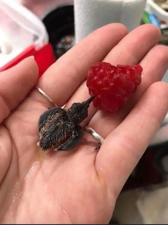 Птенец колибри по сравнению с малиной