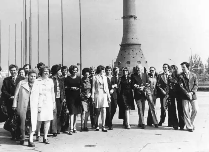 17. Дикторы телевидения на фоне телебашни. 1970-е Москва, ул. Академика Королева. Фото Евгений Халдей
