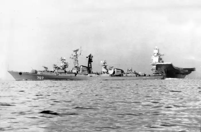22. Большой противолодочный корабль «Красный Кавказ» рядом с будущим тяжелым авианесущим крейсером «Адмирал Флота Советского Союза Кузнецов». Ходовые испытания, 1990 год