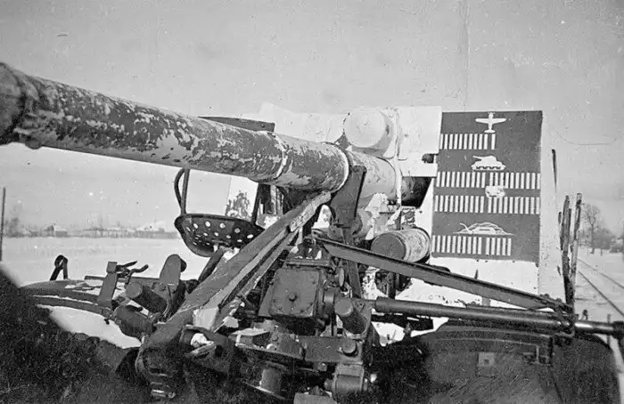 29. Расчет немецкой 88-мм зенитки Flak 18/36/37 отметил поражённые цели. Вторая мировая.