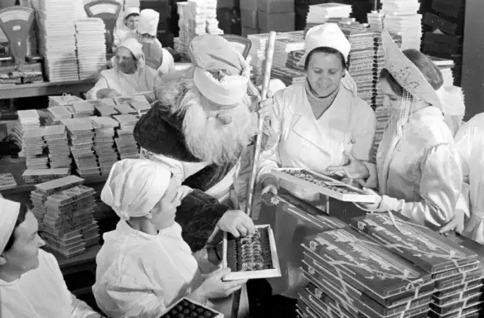 33. Дед Мороз в гостях на Горьковской шоколадной фабрике. Фото В. Войтенко, 1971 год