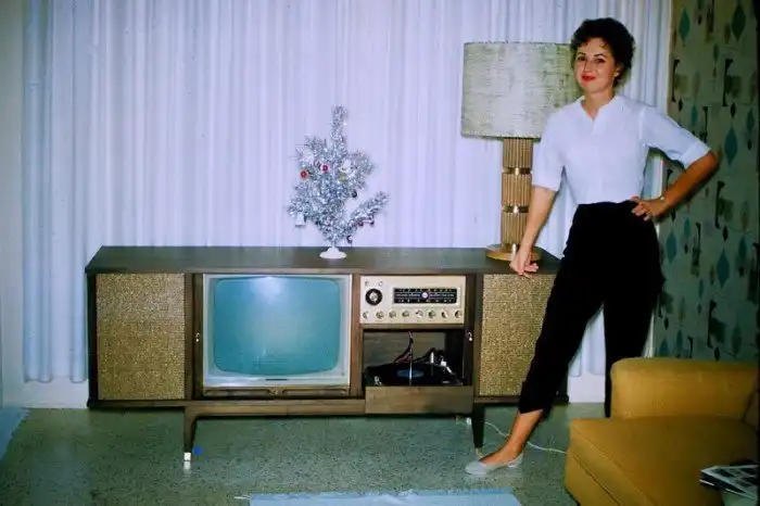34. Симпатичная девушка в брюках Капри с музыкальным телекомбайном на Рождество. США, начало 1960-х