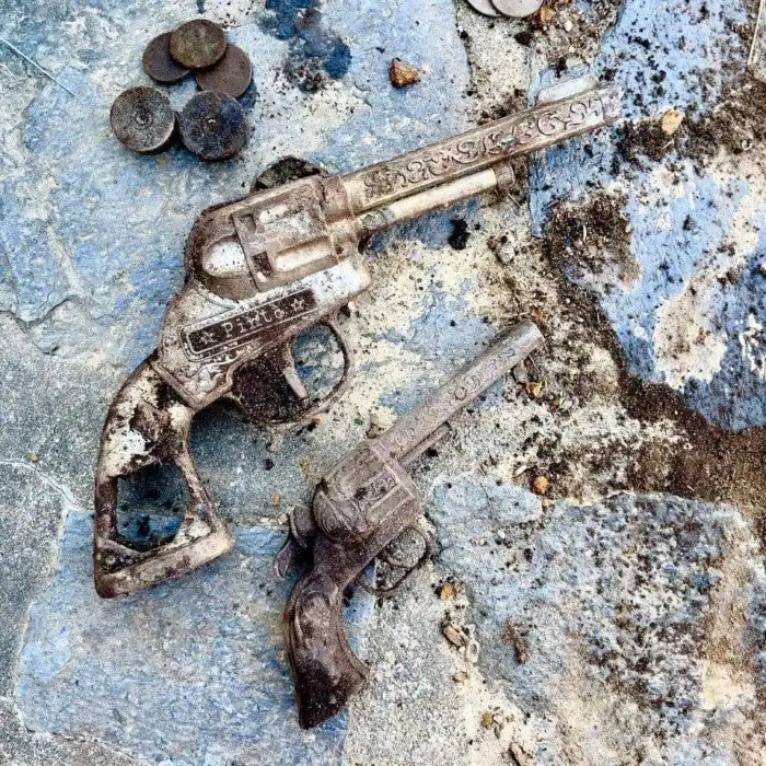 Я нашёл в лесу два игрушечных револьвера. Маленький датируется пятидесятыми, другой шестидесятыми. Интересно, их в разные годы потерял один и тот же ребёнок?