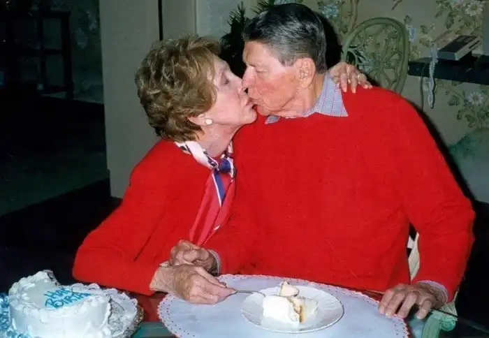 7. Рональд Рейган целуется со своей женой Нэнси Рейган во время празднования своего 89-летия