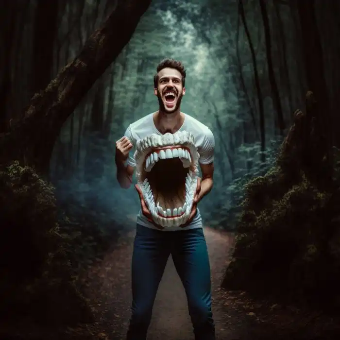 Да, именно так я себе это представлял! Мужчина в лесу с челюстью доисторического мутанта. 10 из 10.