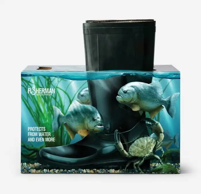 Упаковка прочных сапог для рыбалки имитирует пруд с пираньями