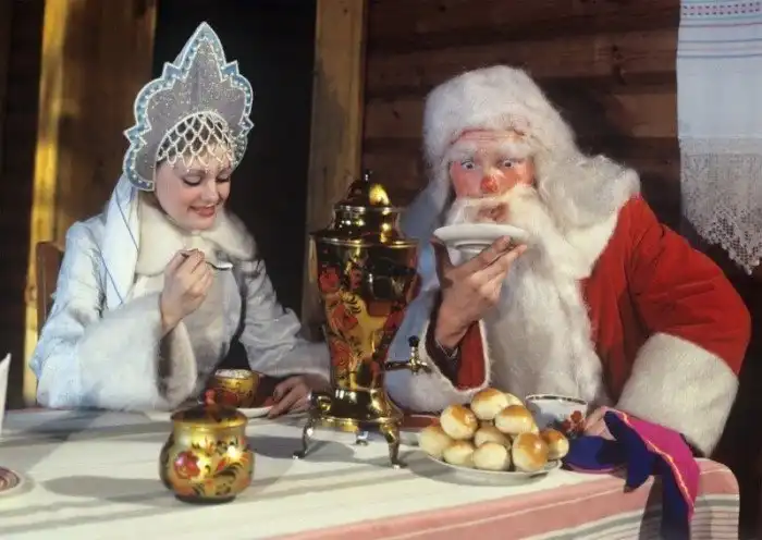 28. Дед Мороз и Снегурочка пьют чай. Алтайский край, 1981 год, © Фотохроника ТАСС, Фото Виктора Садчикова