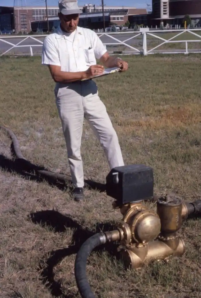 9. Штанга опрыскивателя на опрыскивающем самолете TBM, использованном в проекте по борьбе с еловой листоверткой в 1962 году в Вашингтоне. Джон Ф. Уир (слева) и Ч. Р. Финк на крыле.