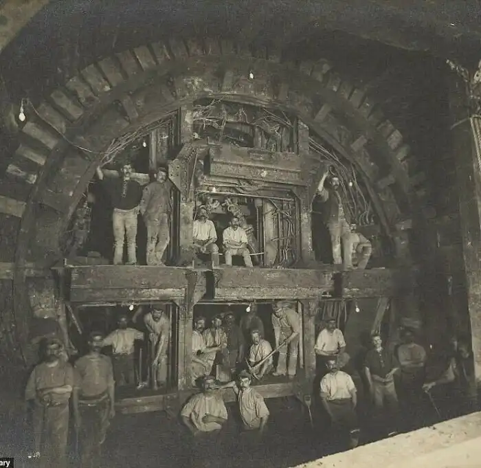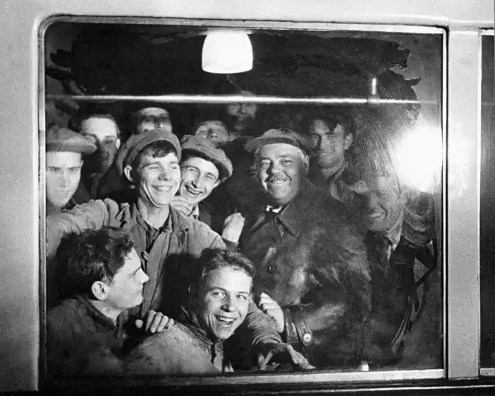Бельгийские шахтеры поднимаются на лифте после рабочего дня, 1900-е годы
