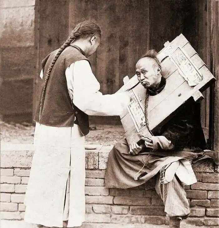 Китаец кормит преступника в канге (устройство для публичного унижения и наказаний), 1905 год