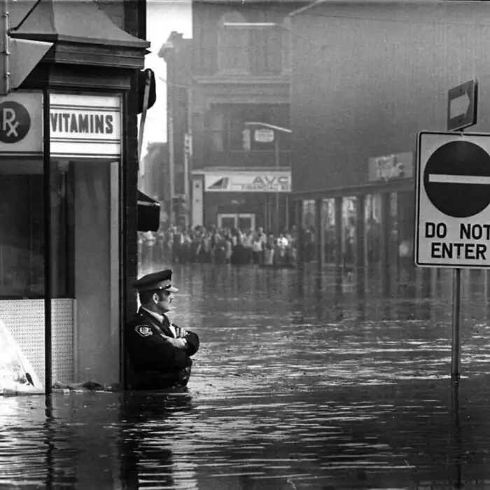 Полицейский охраняет аптеку во время наводнения. Канада, 1974