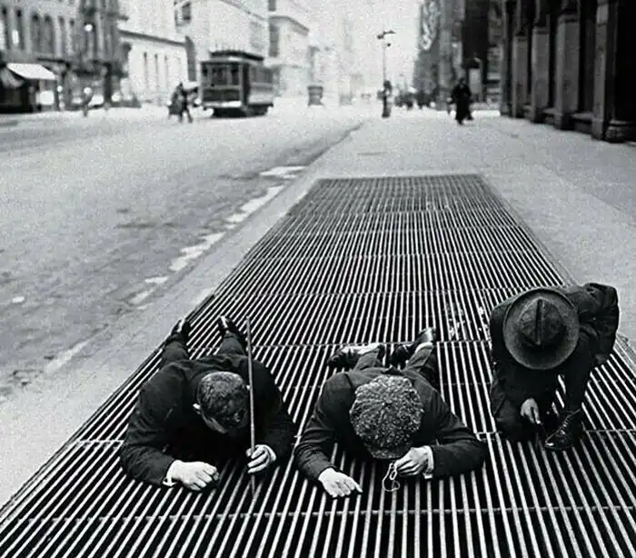 Трое мальчиков "вылавливают" монетки во времена Великой депрессии, Нью-Йорк, 1930