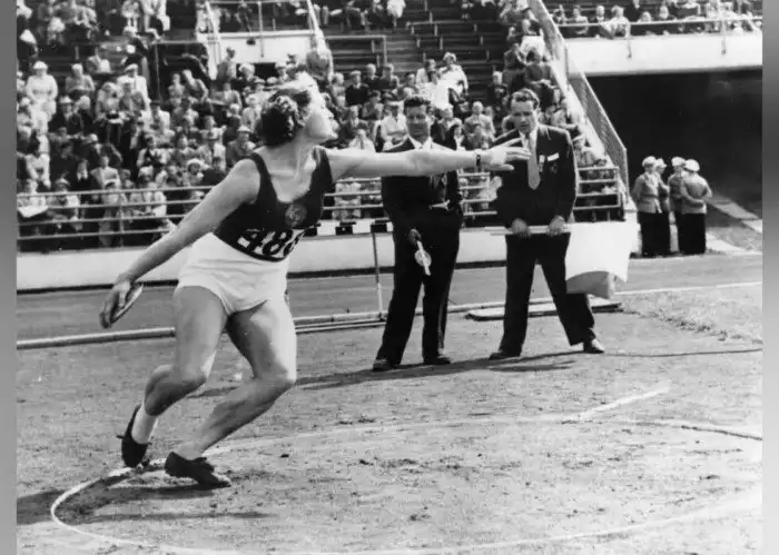 Российская спортсменка Нина Аполлоновна Пономарёва (Ромашкова) во время метания диска, 1952 год. Тогда она стала первой в истории СССР олимпийской чемпионкой